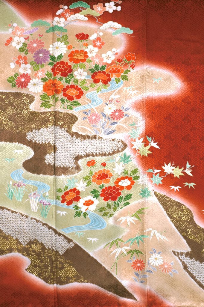 あでやかな茜色の地色に、優美な流水とともに咲き誇る花々。描かれているのは百花の王、富貴の花として愛される牡丹、吉祥文様の菊や梅、花菖蒲などです。裏地を表地と見間違えるほど美しく染め抜かれた逸品は、京友禅着物の老舗、《千總》のお品です。お顔周りはかなり濃い茜色ですので、お顔立ちのはっきりした方におすすめしたい一着です。年齢的には20代、30代の方におすすめです。