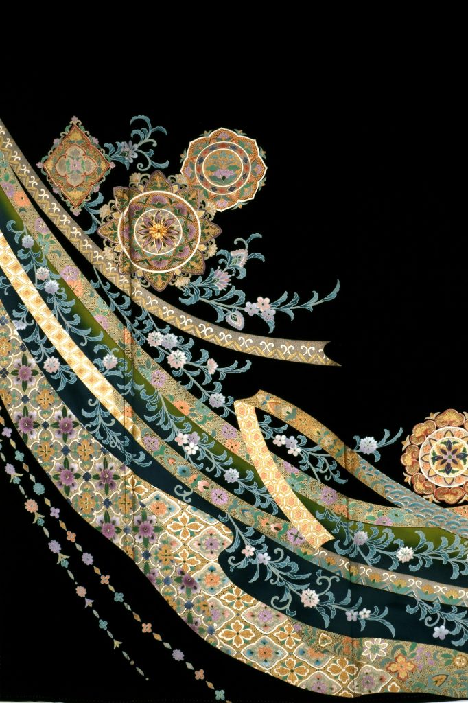 グリーンとゴールドが美しく映える黒留袖です。鬘帯、華やかな華紋に唐花がデザインされています。斜めに流れる絵付けには立ち姿をすっきりと見せてくれる効果があり、お洒落にモダンな雰囲気を楽しんでいただけます。紅いお色やピンクのお色が苦手な方にもおすすめの一着です。