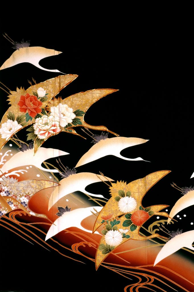 すっきりとした勢いのある絵付けが、今人気です。鶴の輪郭を模写した光琳鶴がはばたく、おめでたいお席にピッタリな黒留袖。紅のお色がより華やかさを演出し、鶴に縁取られた金彩が格調高さを添えています。若々しい印象をお好みの方や、古典的で大胆な柄をお探しの方におすすめです。お写真も煌びやかに写り大変綺麗です!