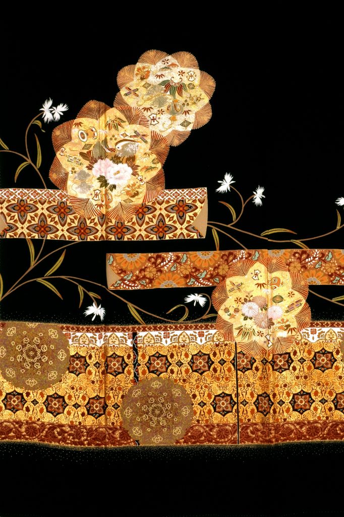 ゴールドと赤、鮮やかな色彩の黒留袖です。アラベスク文様という異国情緒漂うエキゾチックな印象の文様をデザインに取り入れた留袖は、世界的デザイナー、山本 寛斎氏の手によるものです。おしゃれな留袖は、レストランウエディングなどモダンな空間でのお式や、一味違った留袖をお探しの方にぜひおすすめしたい一着です。
