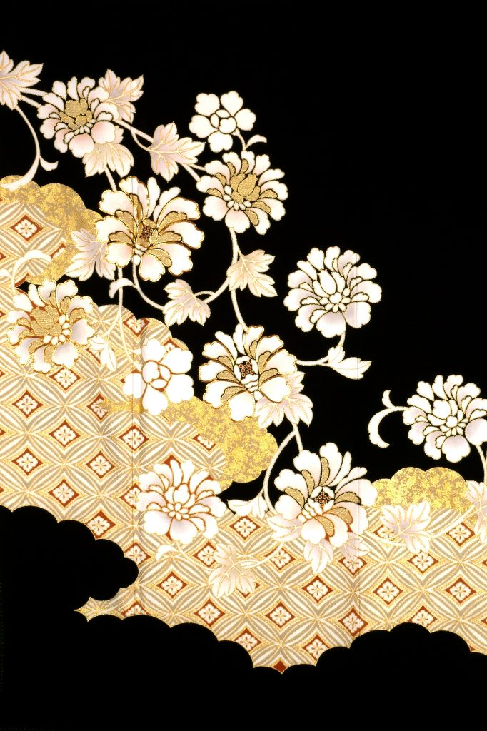 留袖は、背、両袖、両胸の5か所に家紋が入り、上半身に柄が無く裾だけに模様が入る着物で、最も格が高い既婚女性の第一礼装です。結婚式や披露宴などで新郎新婦の母上様、既婚の姉妹、ご親族、仲人夫人が着用します。こちらは金・銀・瑠璃・玻璃・珊瑚・めのう・真珠の貴重な宝を表す七宝と、重厚で品格のある文様の牡丹唐草が描かれた黒留袖です。使われているお色は金と白の二色と少なめですが、すっきりとした意匠は見る人におしゃれでモダンな印象を与えます。