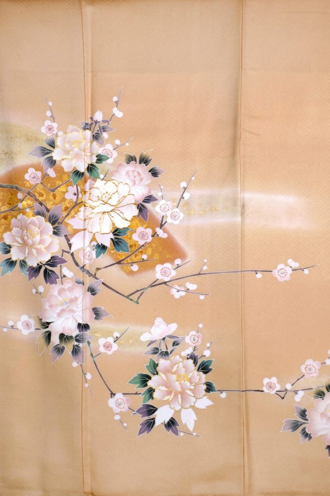 色留袖と黒留袖は着物の中で最も格式高い着物です。ベージュの地色に描かれた牡丹と梅の文様。富貴のシンボルである牡丹は古来より重用されており、華やかな祝いの席にぴったりな色留袖です。明るく華やかな雰囲気を好まれる方におすすめです。お若い方からご年配の方まで、幅広い年代の方にお召し頂ける一着です